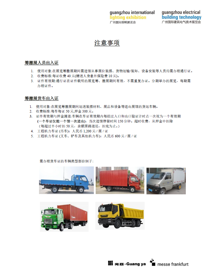 感谢你们对广州国际照明展览会暨广州国际建筑电气技术展览会的支持。为净化中国进出口商品交易会(广州交易会) 展馆办展环境,强化日常展览筹撤展施工安全生产,展馆方现要求全馆参展商/施工人员及货车实施实名制预约办证与货车计时查验,为使贵司顺利完成展位搭建议工作,请您认真阅读以下事项:
