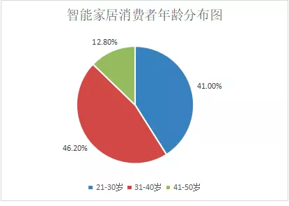 从智能家居消费用户年龄分布上来看,87.2%的消费者集中在21-40岁,12.8%的消费者集中在41-50岁,这表明智能家居用户大部分为80、90后群体。
