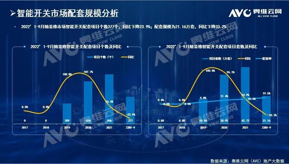 ▲2022年1-9月精装修市场智能开关配置率为19.5%,配置率同比增长了3.8%