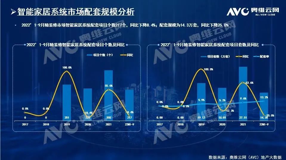 由近期奥维云网(AVC)地产大数据显示,2022年前三季度的开盘楼盘中,精准装项目个数和套数分别同比下降39%和46.2%,与此同时,精装项目中以智能家居为代表的智能部品配置率则呈逆势增长态势。作为新兴部品的智能家居,正处于增长期。